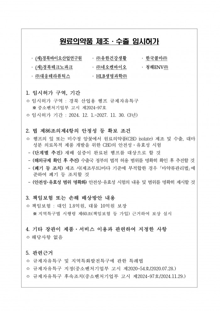 경북산업용헴프 규제자유특구 이용자 고지(임시허가)