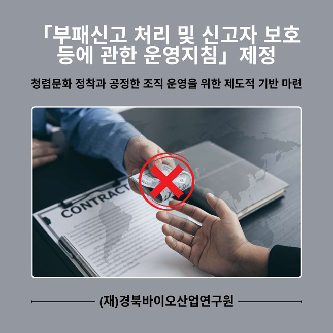 경북바이오산업연구원은 반부패·청렴문화 정착을 위해 「부패신고 처리 및 신고자 보호 등에 관한 운영지침」을 새로 제정하였다.