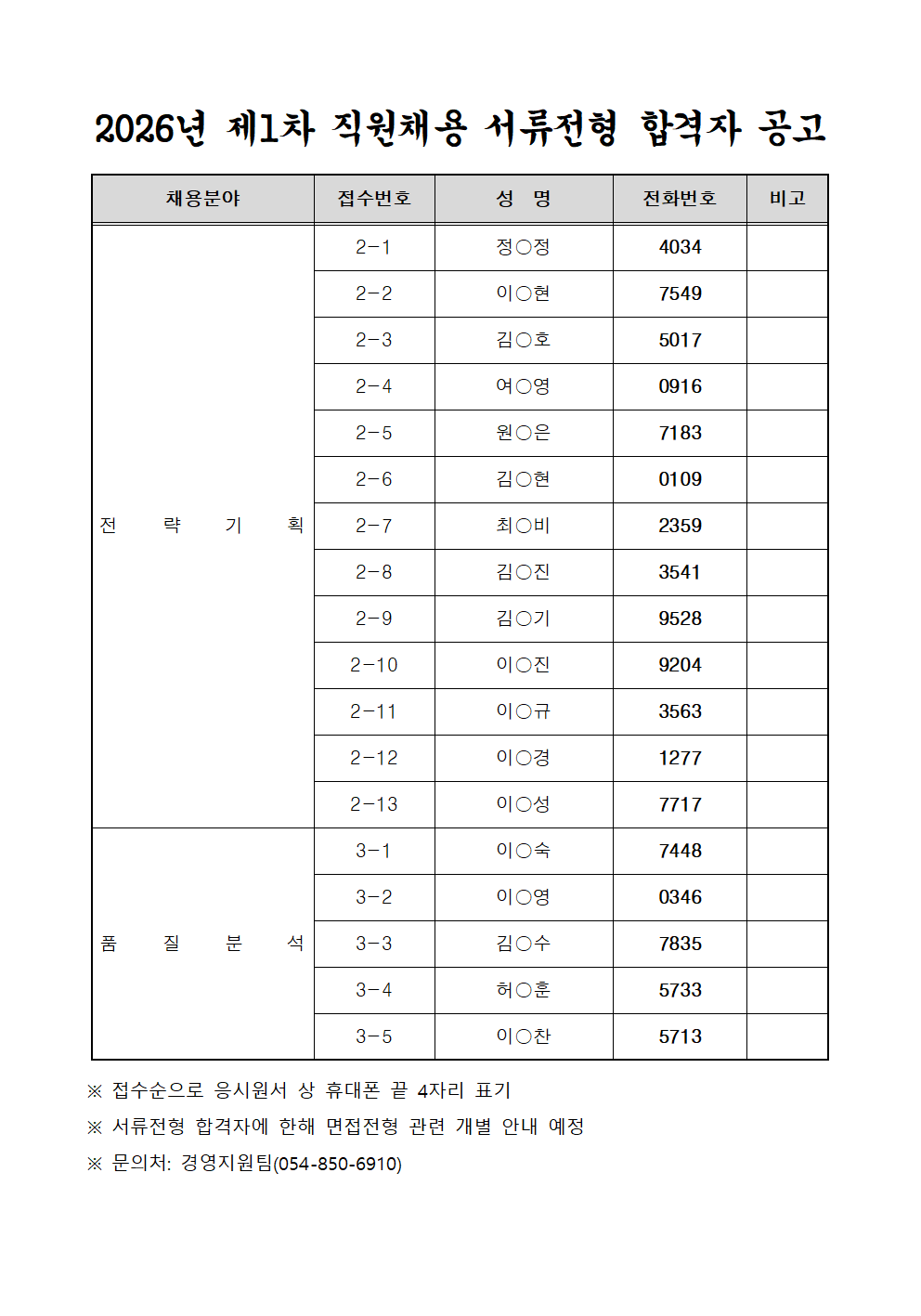 2026년 제1차 직원채용 공고 서류전형 합격자 공고