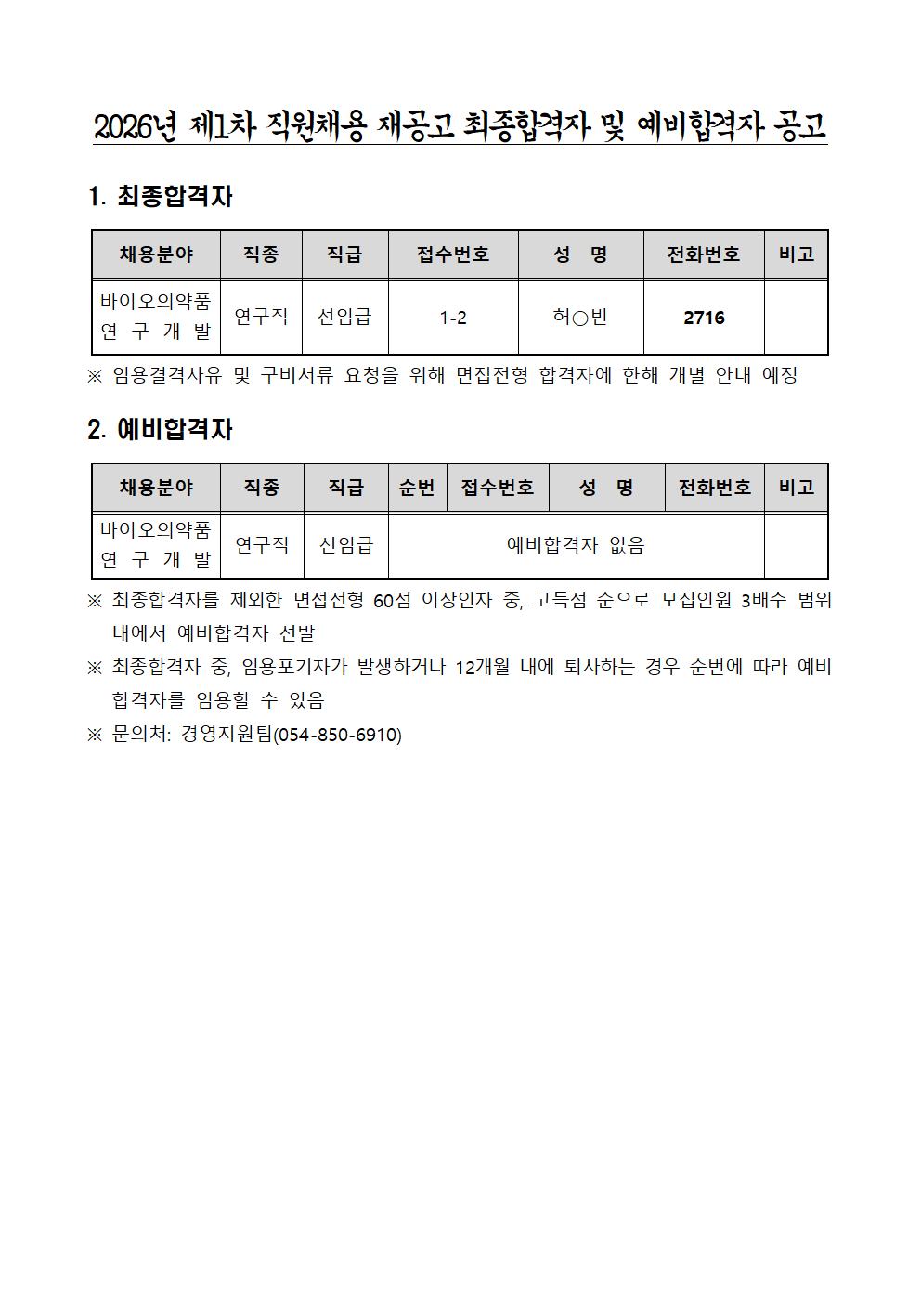 2026년 제1차 직원채용 재공고 최종합격자 및 예비합격자 공고