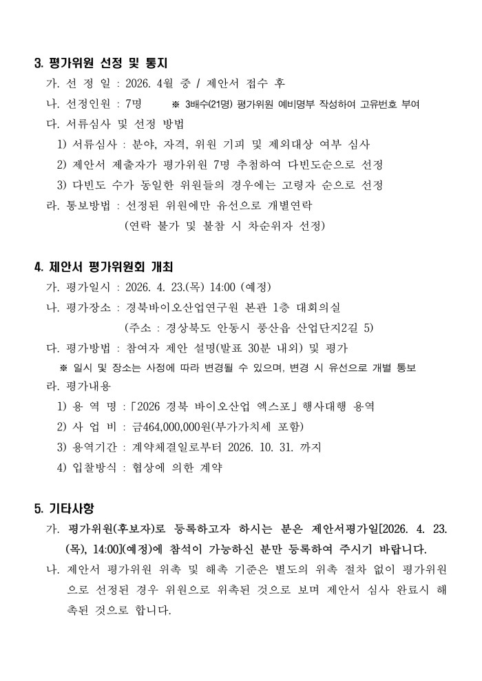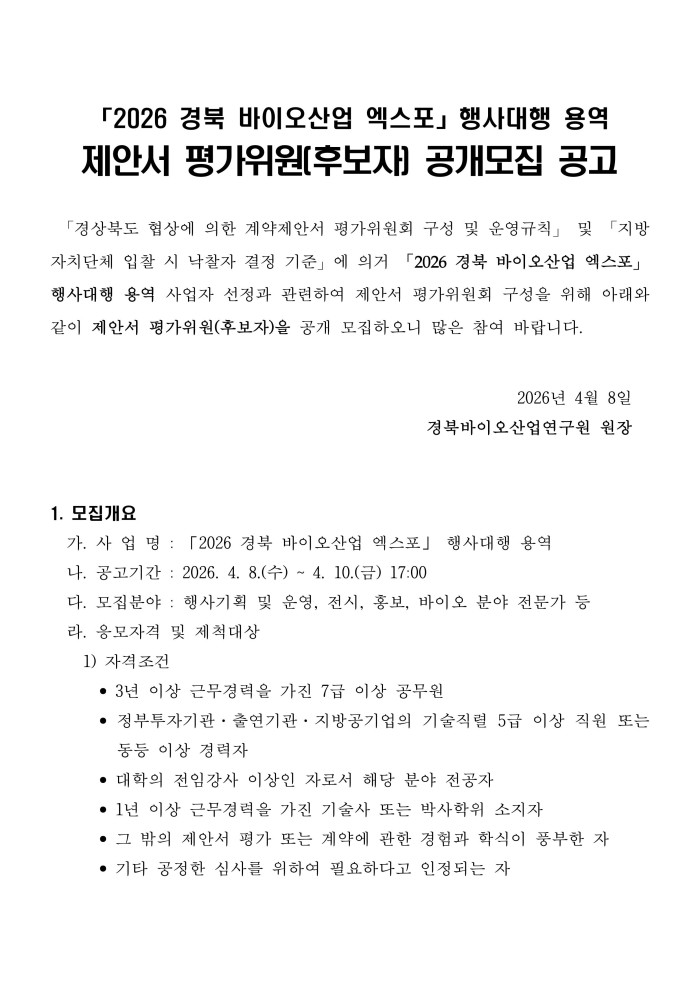 2026 경북 바이오산업 엑스포 행사대행 용역 제안서 평가위원회(후보자) 공개모집 공고