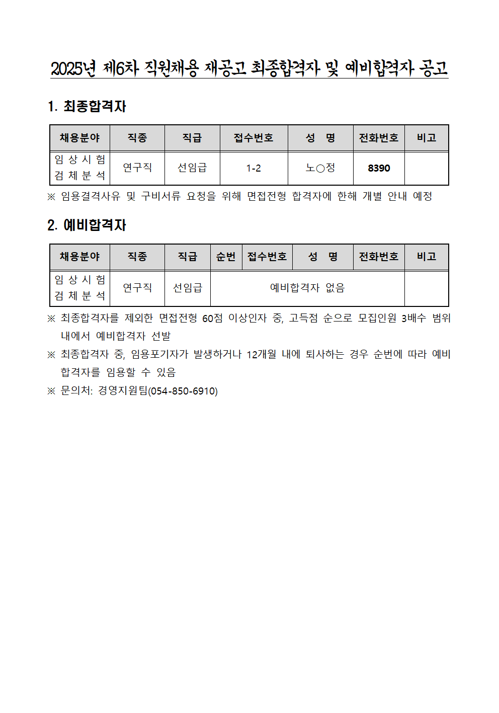 2025년 제6차 직원채용 재공고 최종합격자 및 예비합격자 공고