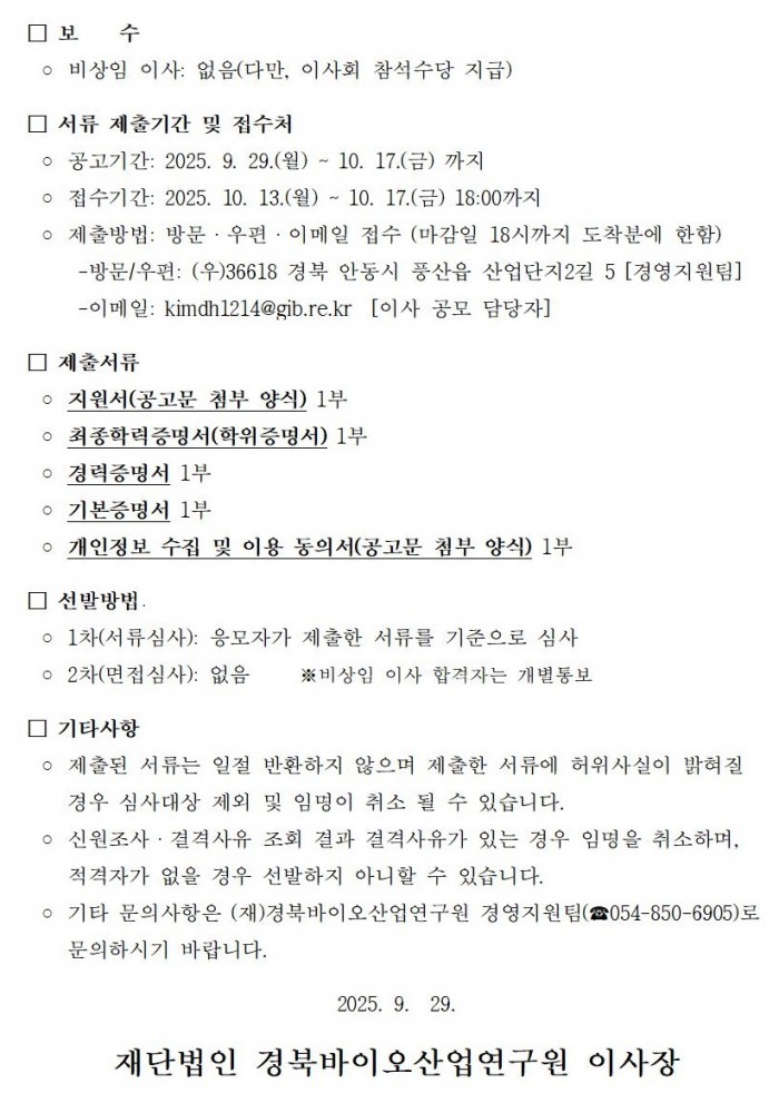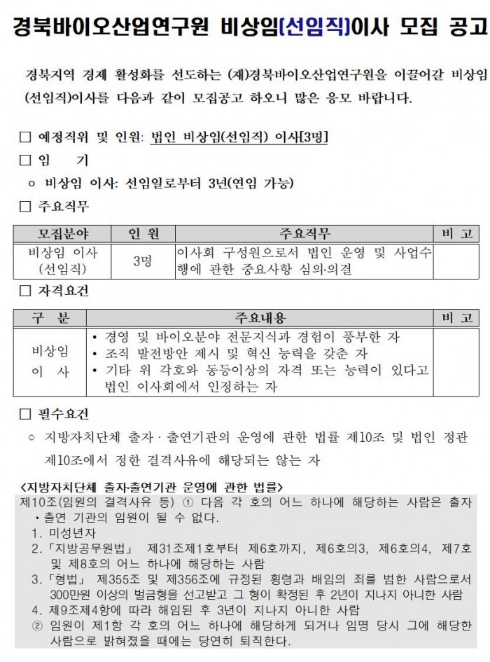 경북바이오산업연구원 비상임(선임직)이사 모집 공고