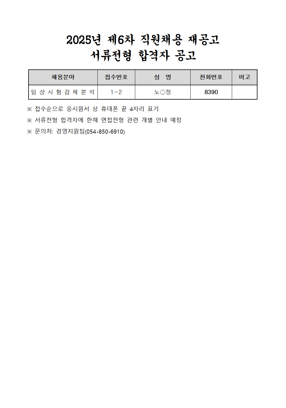 2025년 제6차 직원채용 재공고 서류전형 합격자 공고