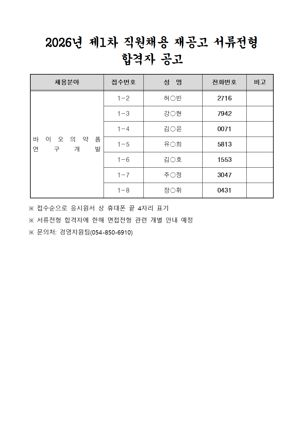 2026년 제1차 직원채용 재공고 서류전형 합격자 공고